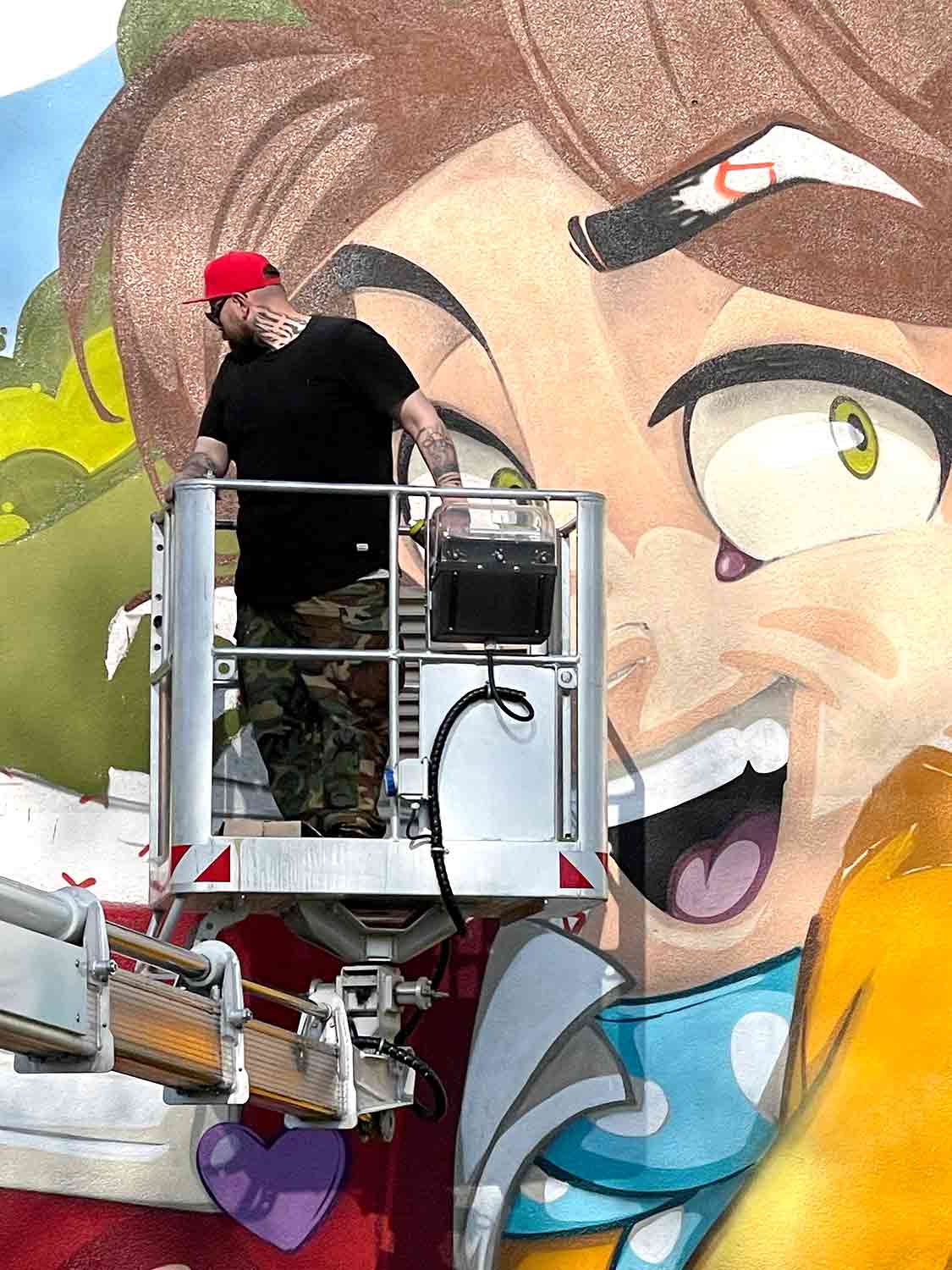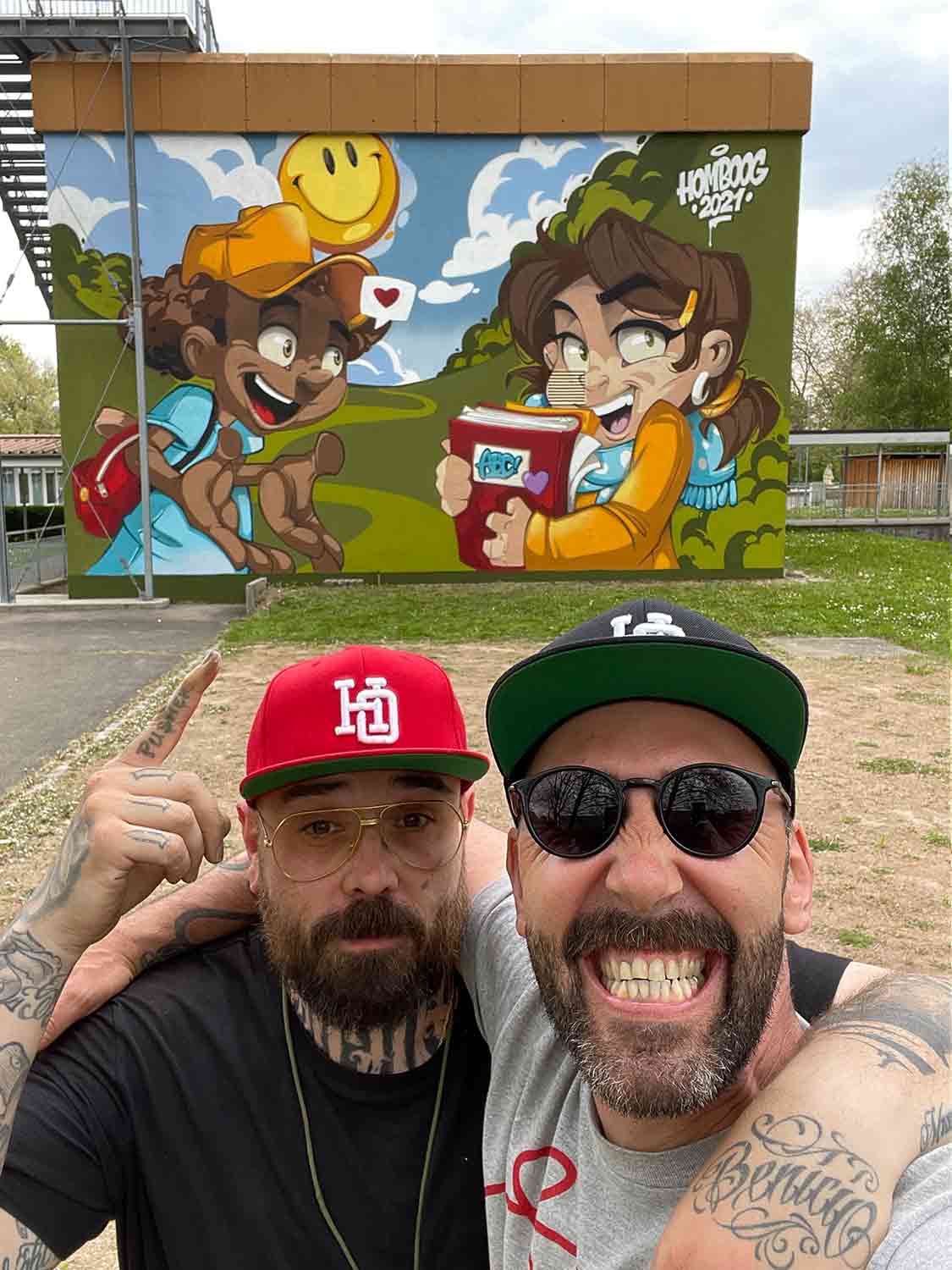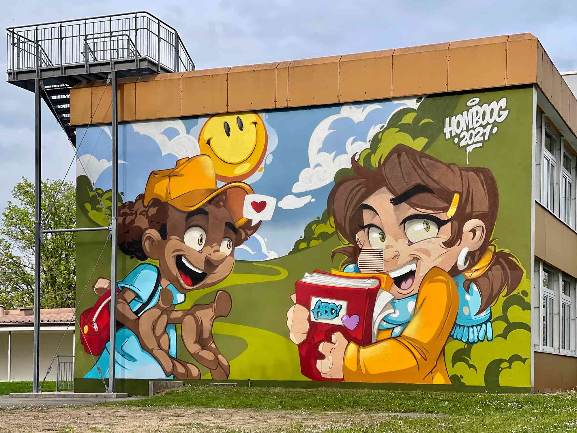 “Goetheschule the Third” was our topic in April 2021. During the last years my partner in crime HOMBRE and me painted a few walls for the GOETHESCHULE RHEINFELDEN – a primary school in the most southern part of Germany and it looks that they like our work. They just gave us some themes like SCHOOL, TEMWORK or MULTICULTURAL to develop a design. This time Hombre was responsible for design and colours and it didnt take long to inspire the principal and we fixed a date to start. After a few days of delay (because of massive snow and rain) we finally shouted out: Team Homboog is back! With a really good support by our friends of MONTANA CANS and the facility manager Mr.Peschel we finished the project within 3 days. And it looks like it makes lots of young and old people smile. See you next time!