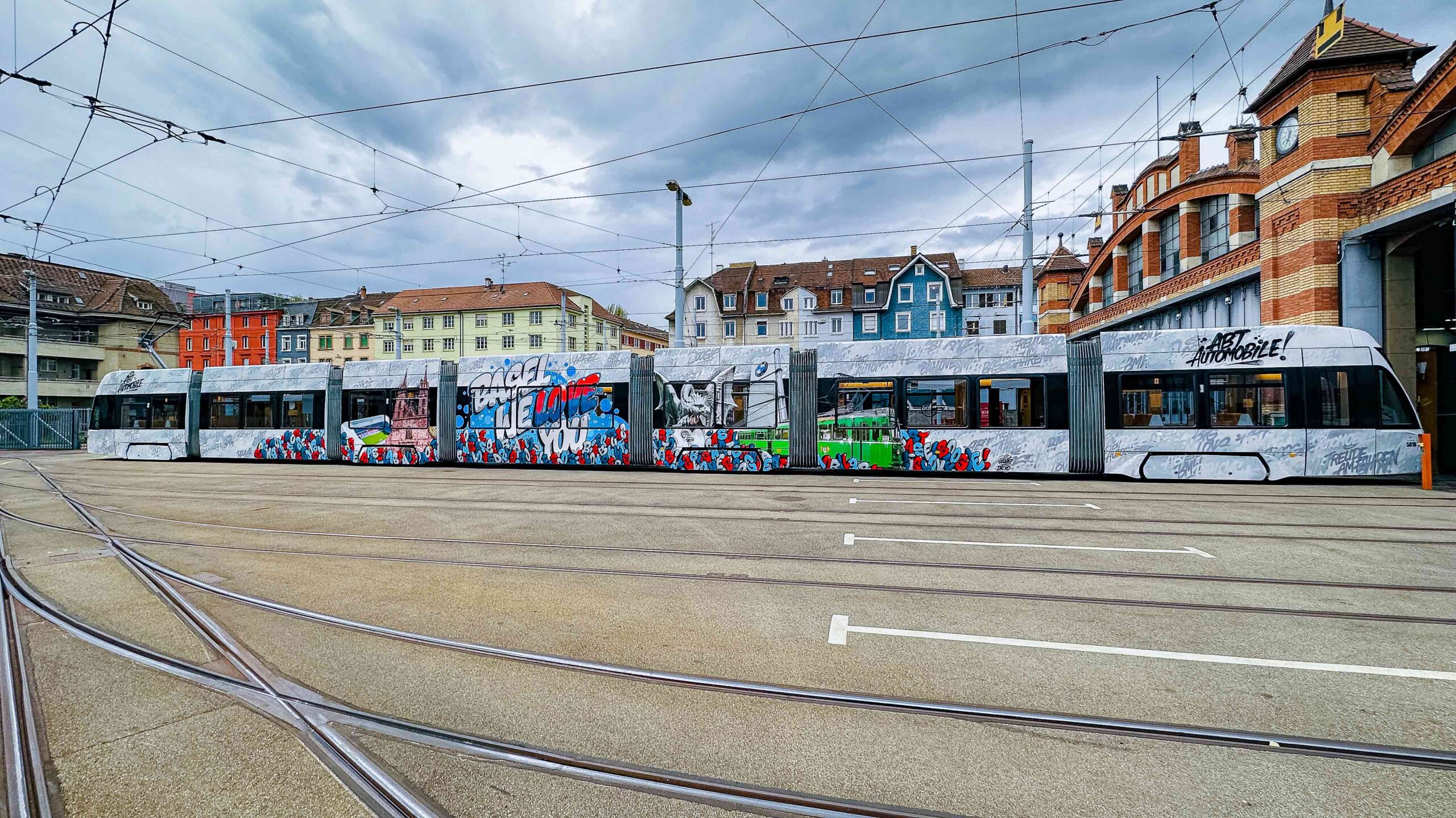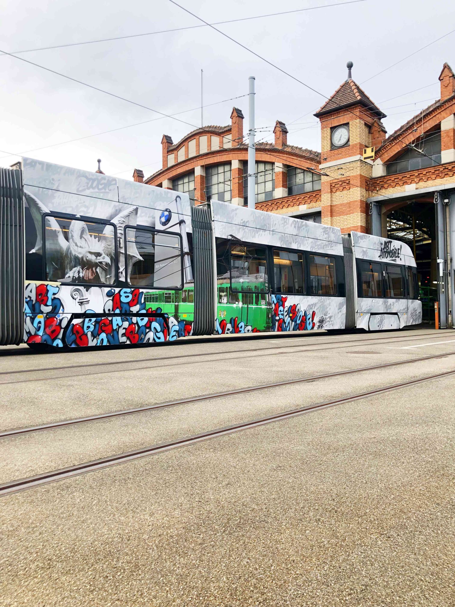 Our first joint project was not long in coming either, because I had the honor of designing a complete side surface of the venerable Basel tram. Topic: BASEL – WE LOVE YOU! The time window was very small (I had exactly 2 days and 2 nights) and so I decided to activate my good friend and fellow artist Doctor Yo from Berlin. We have already realized some larger projects together and I know for sure that I can rely on him 100%. In mid-April the time had finally come, the draft was ready and we could start. Due to the regulations in passenger transport, it was of course not possible to paint over the panes. However, there are also good solutions for such small problems. So we decided that the company Moving Media from Basel foiled all non-sprayable surfaces with translucent perforated fleece, on which parts of the design were printed. We were able to work on all other surfaces with our tool – the spray can. In the end, probably the best and safest solution to achieve a respectable result. Thanks again to BVB, Moving Media, Abt Automobile, The Sarhan Company and Ainiac Entertainment for the great teamwork. The feedback was sensational and we gave Basel a little eye-catcher – if only for two months.