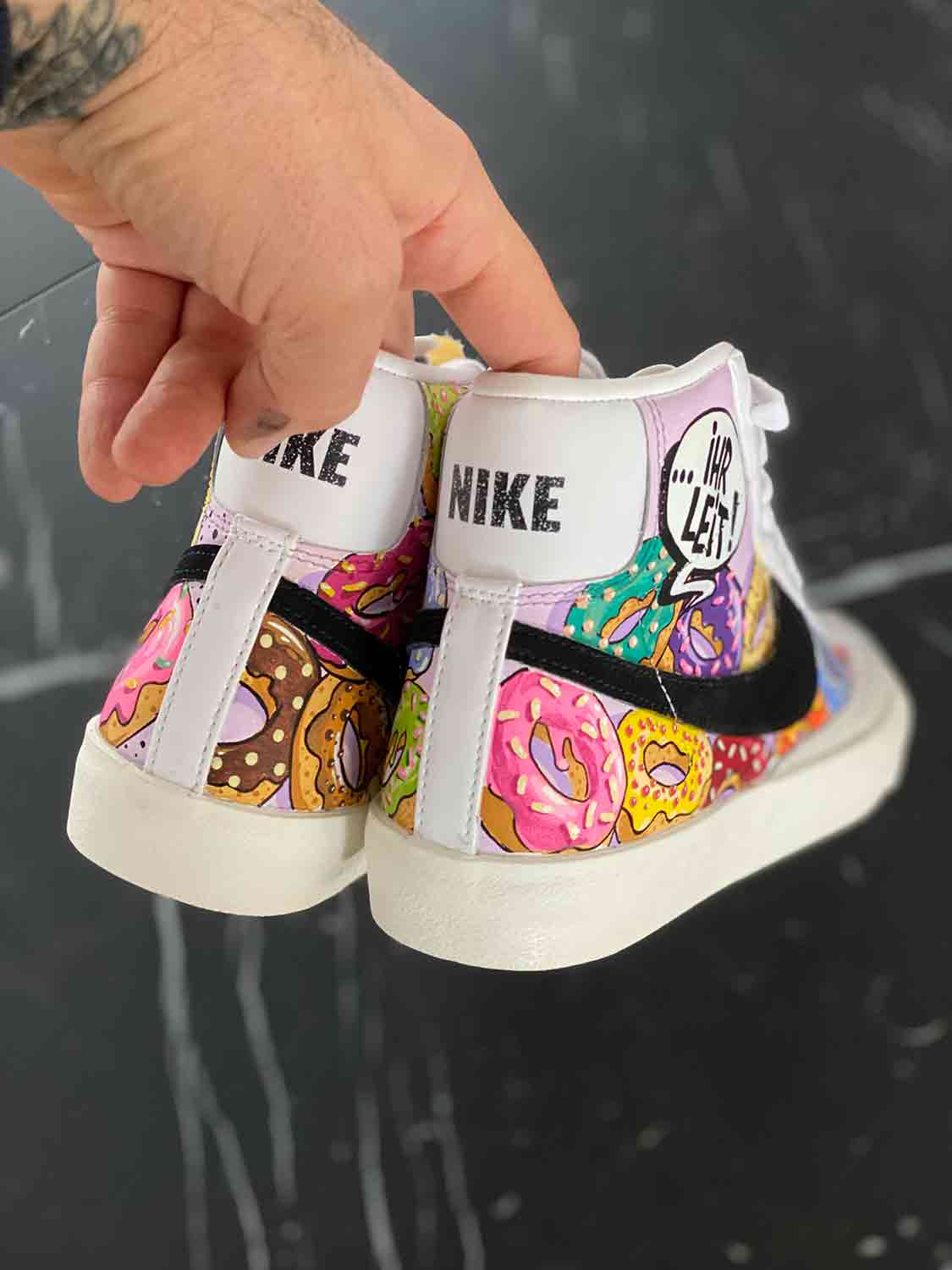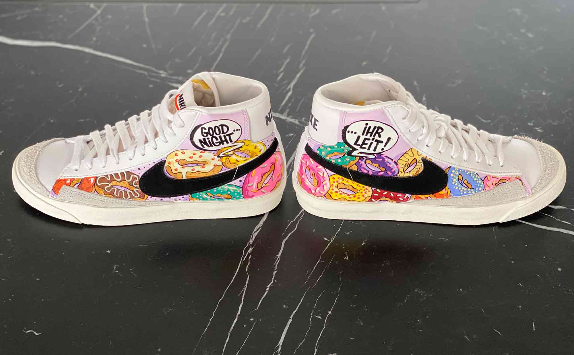 I had the pleasure to paint a few pair of different kicks during the last weeks. Sometimes with some simple wishes from the client and sometimes completly free. I`ve painted almost every pair with acrylic markers of the well known European brands MONTANA, MOLOTOW an sometimes POSCA. If you`re not sure then you should cover all the spaces you want to leave empty with tape. It takes lots of time but sometimes it`s worth it. The next thing is that the surface has to be free of fat. That means: clean it careful before you paint it. If there`s still some fat on it you can see it cause the paint won`t stick on the surface. Let it dry, clean it and do it again…several layers!