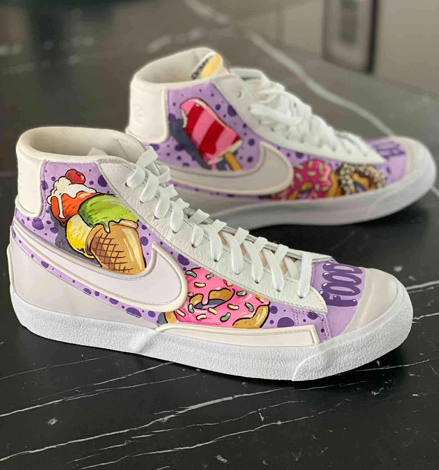 For the design: I always do a photo of the sneaker and do a sketch on the photo of the shoe on the iPad. The spaces are often very small and very asymmetric. So it`s sometimes hard to find a good composition.